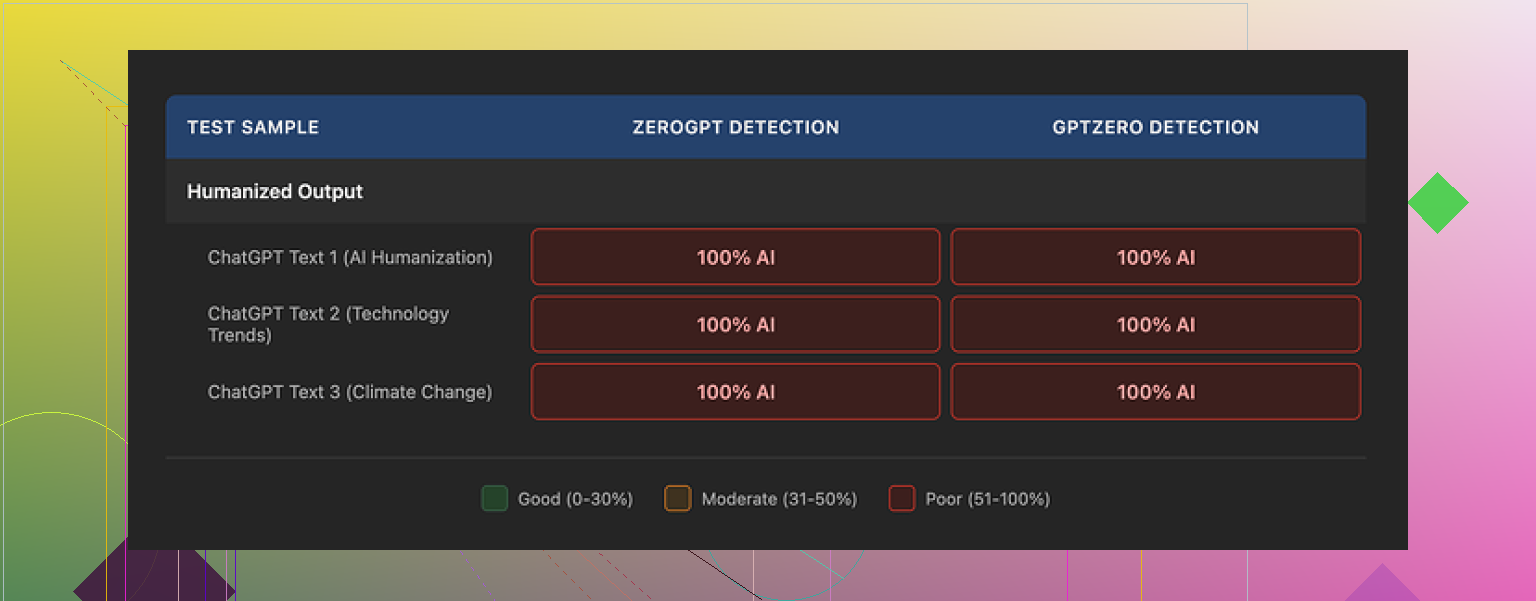 Every single “humanized” version came back as 100% AI on all three. Not 70, not 80, a clean 100 every time.