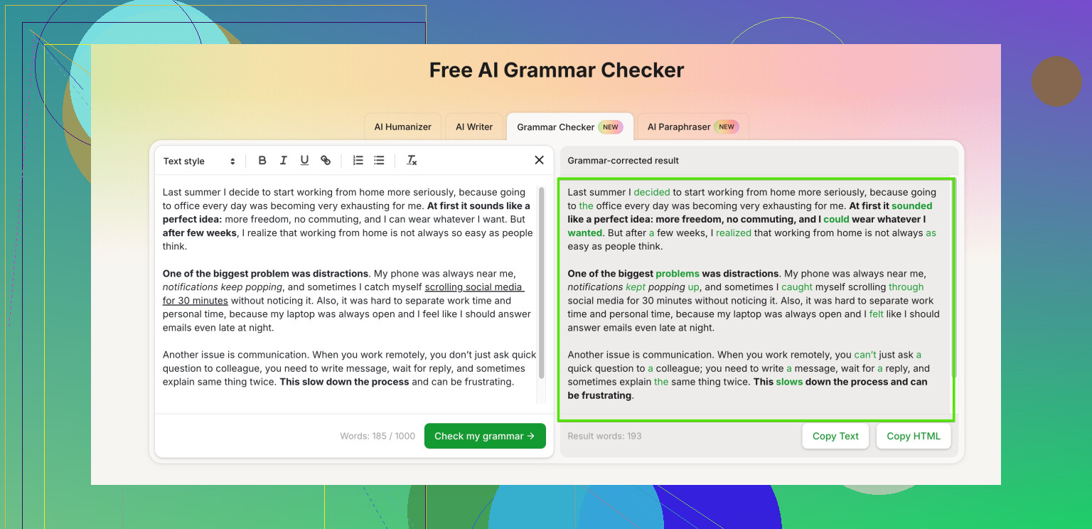 Tools are good at surface errors, but your actual value is learning your own pattern of mistakes. Once a week, take one corrected text (from Clever Ai Humanizer or wherever) and: