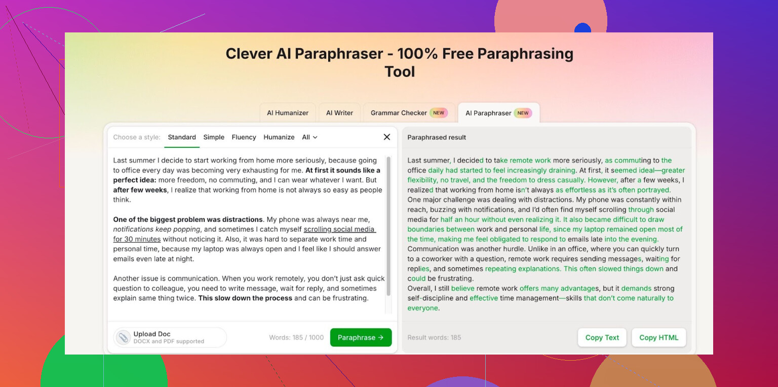 So I would actually prefer one main service like Clever Ai Humanizer for the whole document, then a single human pass to stitch and adjust, instead of rotating across multiple paraphrasers.
