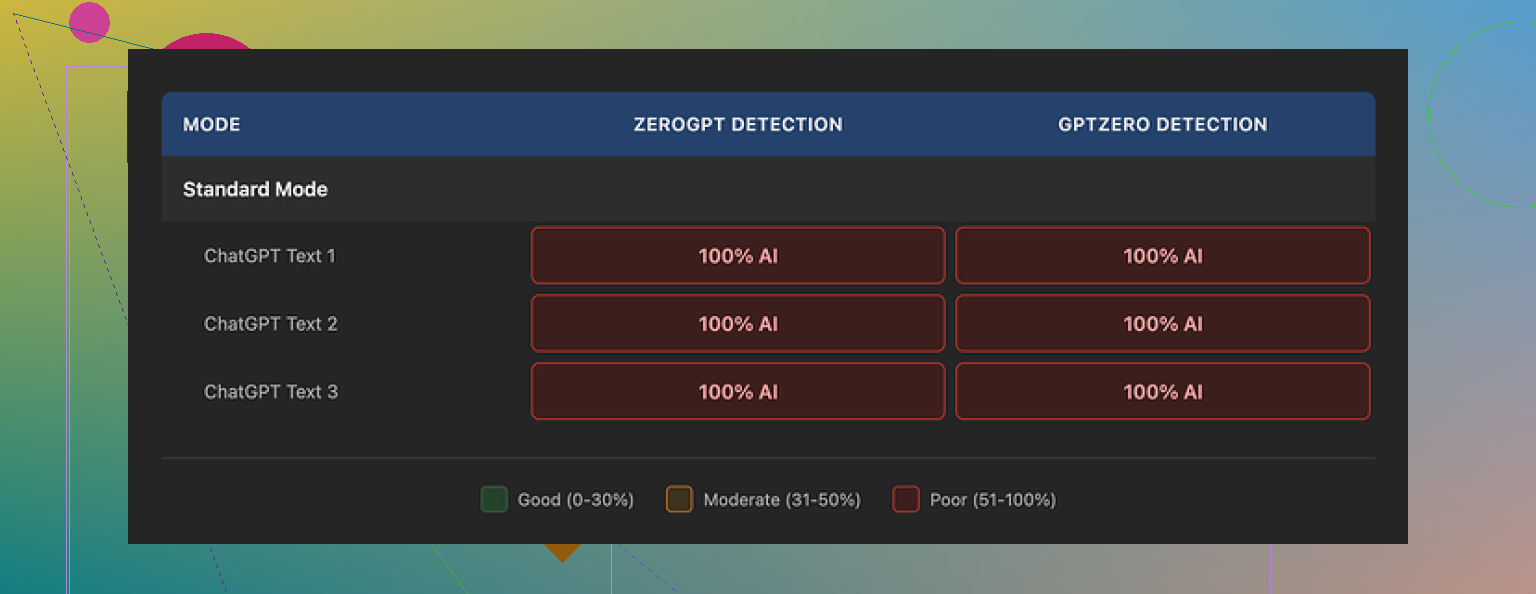Detectors do not only look at specific characters or single phrases. They look at those deeper patterns. GPTinf did not break those. So even with clean formatting, the detectors had no trouble calling it out.