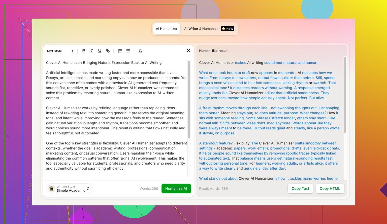 Clever AI Humanizer a tendance à normaliser le texte en “copie blog polie, vaguement conviviale”.
