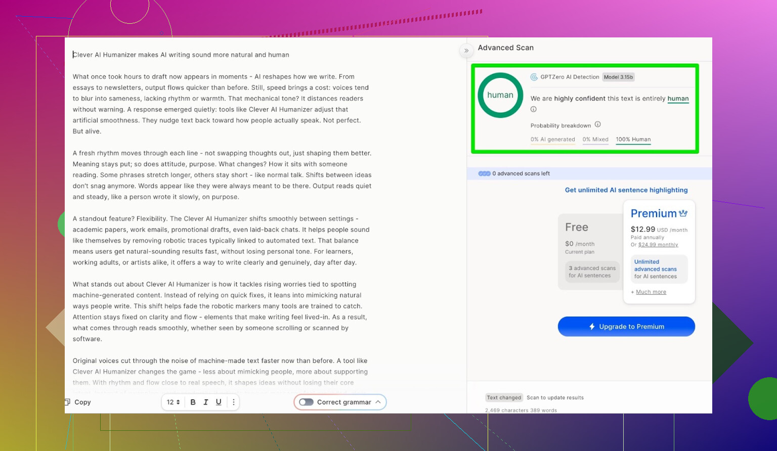 Dans mes propres tests, Clever AI Humanizer a fait mieux qu’une bonne partie des autres outils, gratuits comme payants :
