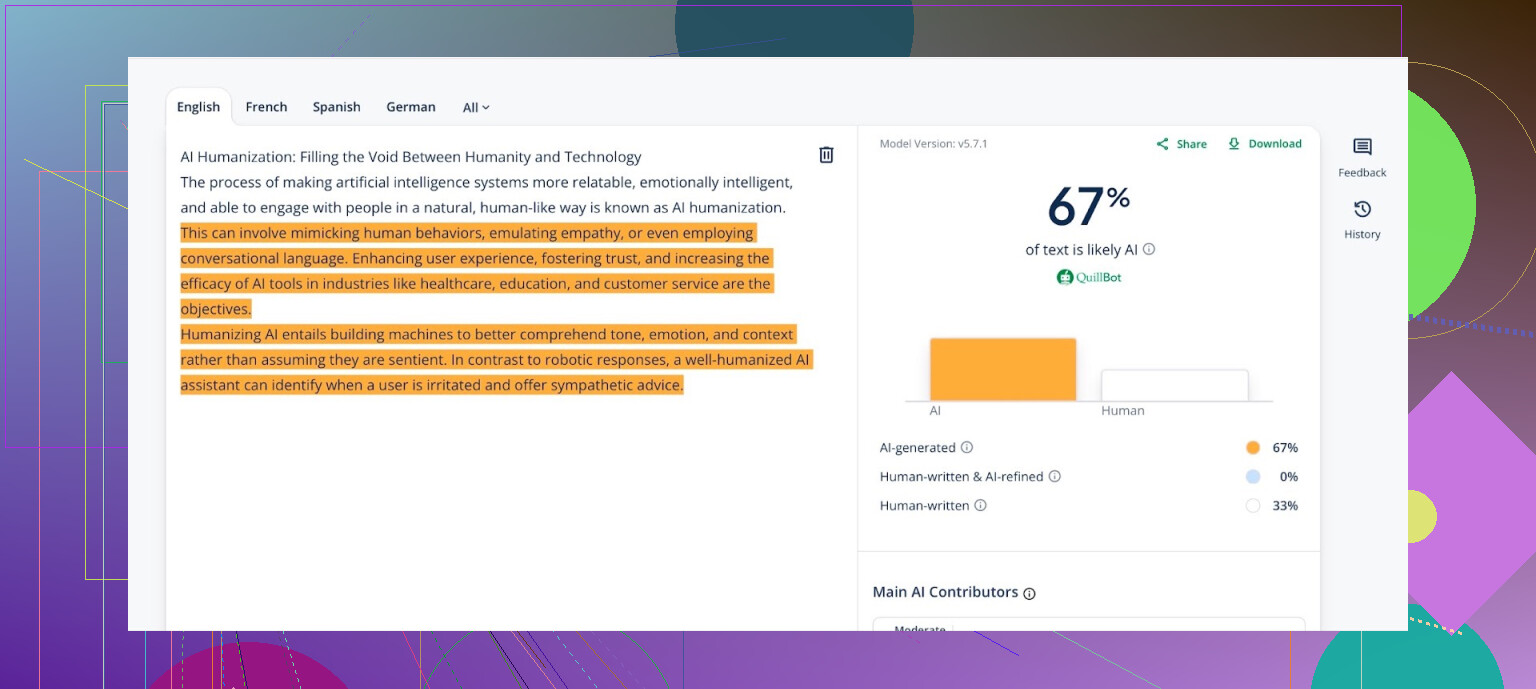 Quillbot se vende como “parafraseador com poderes de humanização de IA”. Tem até detector próprio integrado.