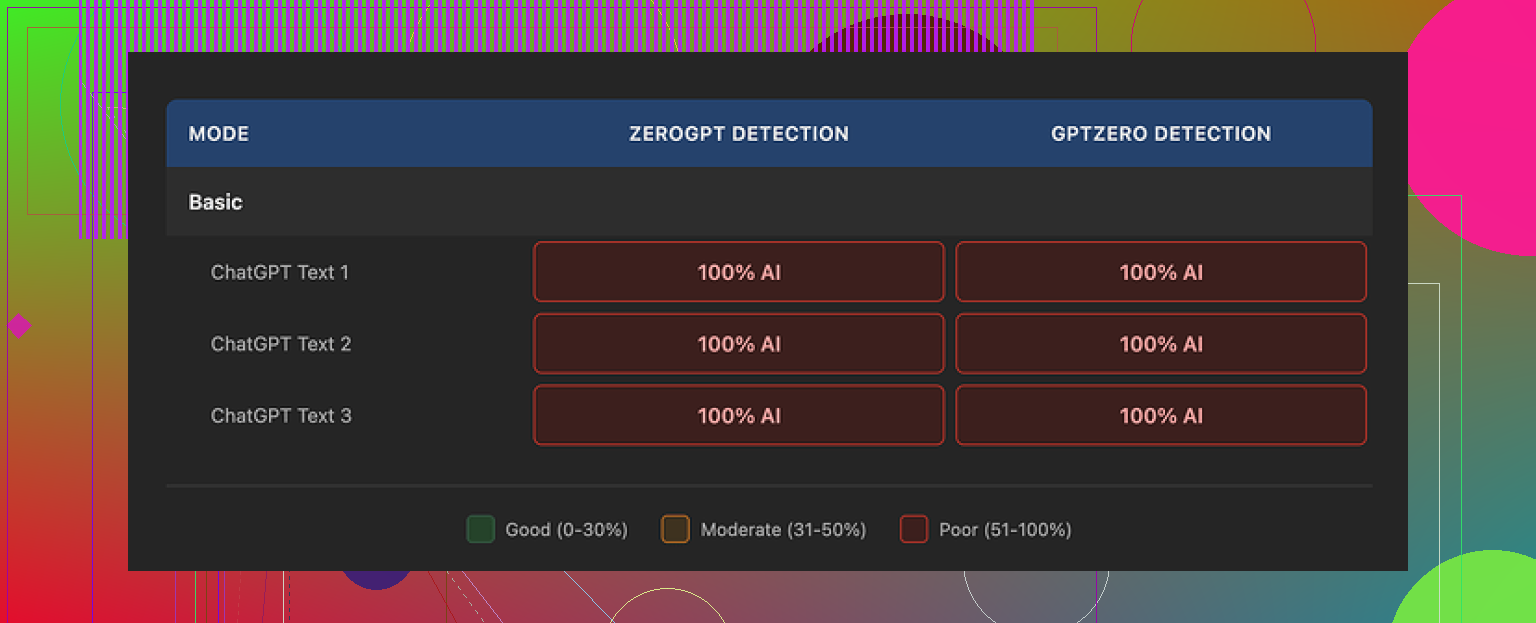 Every single sample I ran through their humanizer, both in Basic and Advanced, came back as 100% AI on GPTZero and ZeroGPT. No exceptions.