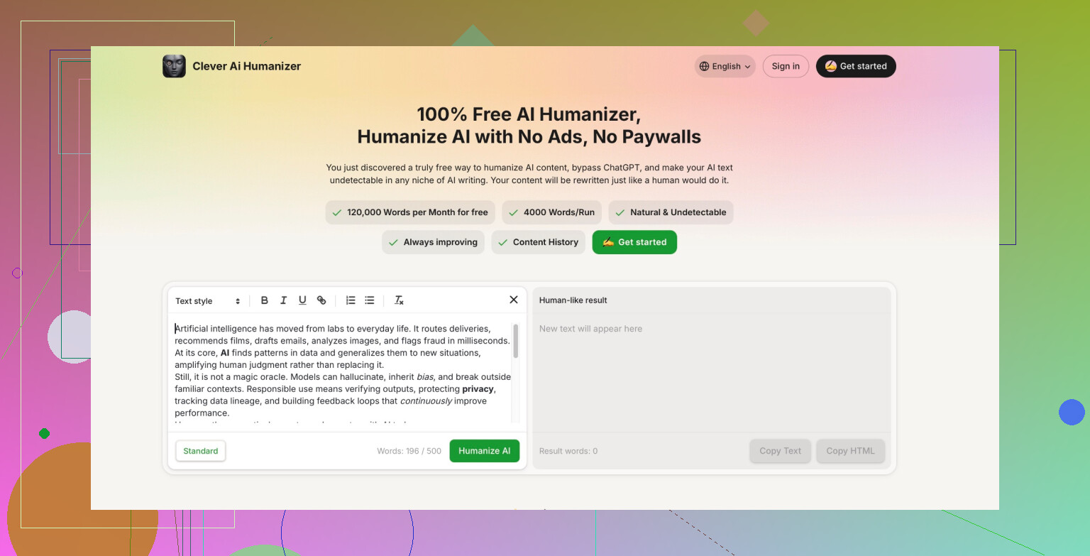 Alright, listen up: Writing with giant words and over-formal sentences doesn’t fool anyone. That’s what cracks me up about all those “advanced” AI tools—they swing so hard for academic gold that stuff starts reading like it was copy-pasted from a textbook. But Clever AI Humanizer keeps things breezy, like a real person typed it over coffee between Zoom meetings. Missed a comma? Meh. As long as bots can’t spot it and my friends don’t roast me, mission accomplished.